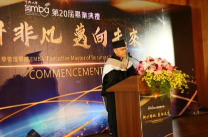 興大副校長詹富智代表校長出席,勉勵畢業生在追求真理與卓越的過程中,要繼續虛心努力的學習,並期許眾位菁英領袖能多串聯學校的資源與能量,共創1+1>2的效益,引領社會並做出貢獻。校友總會莊嘉郁理事長則以自身經驗,肯定EMBA這個學術平台,讓社會菁英們能夠與時俱進、不斷學習,並持續對母校關心貢獻。梁火在學長則表示他身為會計師,見過無數企業家忙於事業卻忽略身體狀況而造成遺憾,他以自身連續十四年風雨無阻的晨跑來期勉畢業生,在忙碌之餘能夠建立規律運動,健康才是一切的根本。